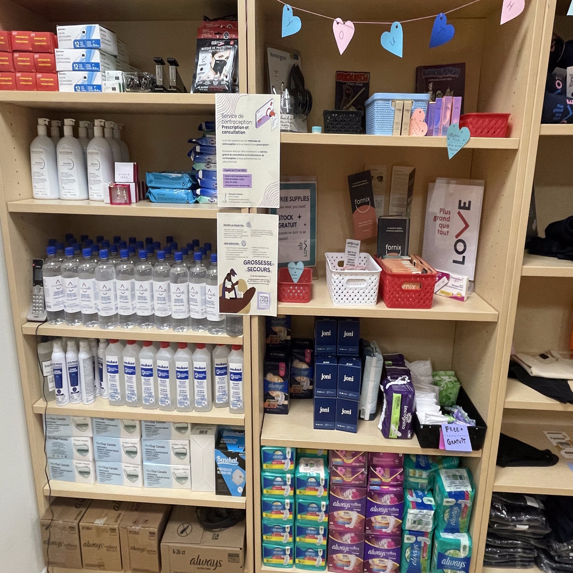 廊下の棚にはモントリオールの会社、団体などから寄付された生理用品や生活必需品、ちょっとした食品(パスタや缶詰など)などが常備されていて、必要であればユースたちは無償で持ち帰れます。